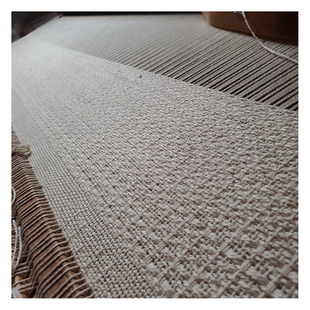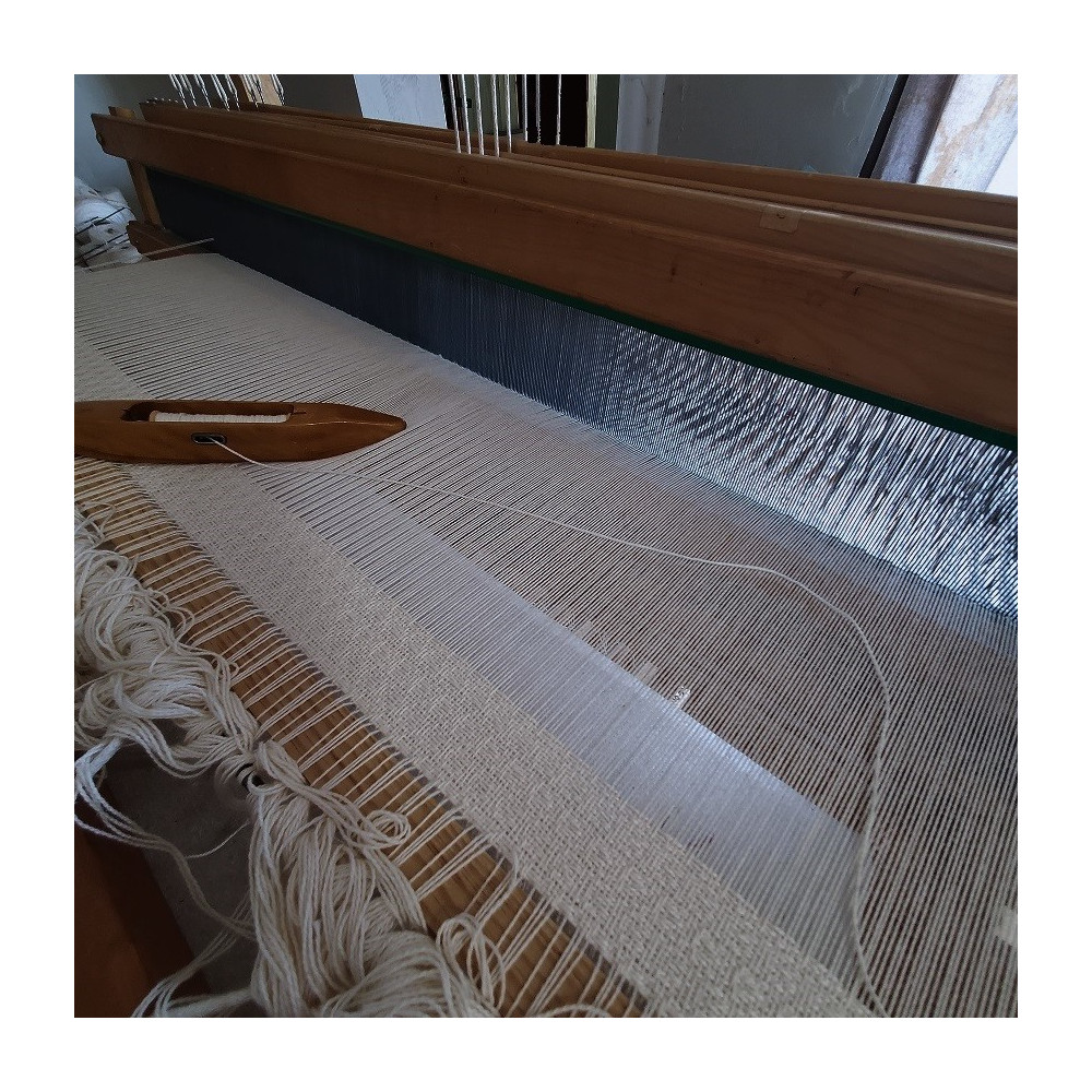 Weaving width 45″, 4 shaft floor loom, 12 epi, 5/2 & 3/2 cotton from the USA
