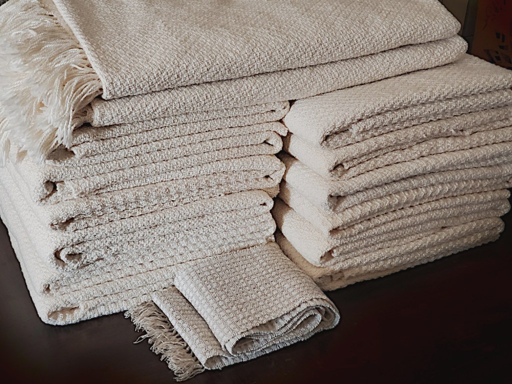 Weaving width 45″, 4 shaft floor loom, 12 epi, 5/2 cotton yarn warp from the USA & 3/2 + 5/2 cotton yarn weft from the USA