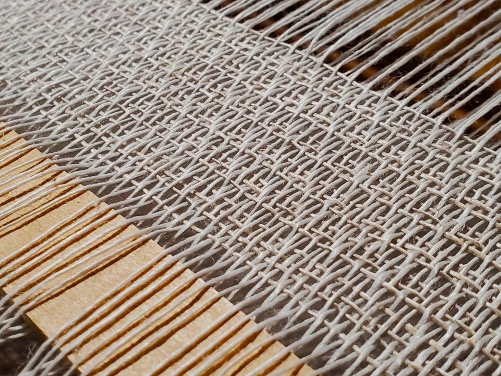 This yarn is a natural yarn, 2500 ypp (yards per pound), spaced at 16 dpi (dents per inch)