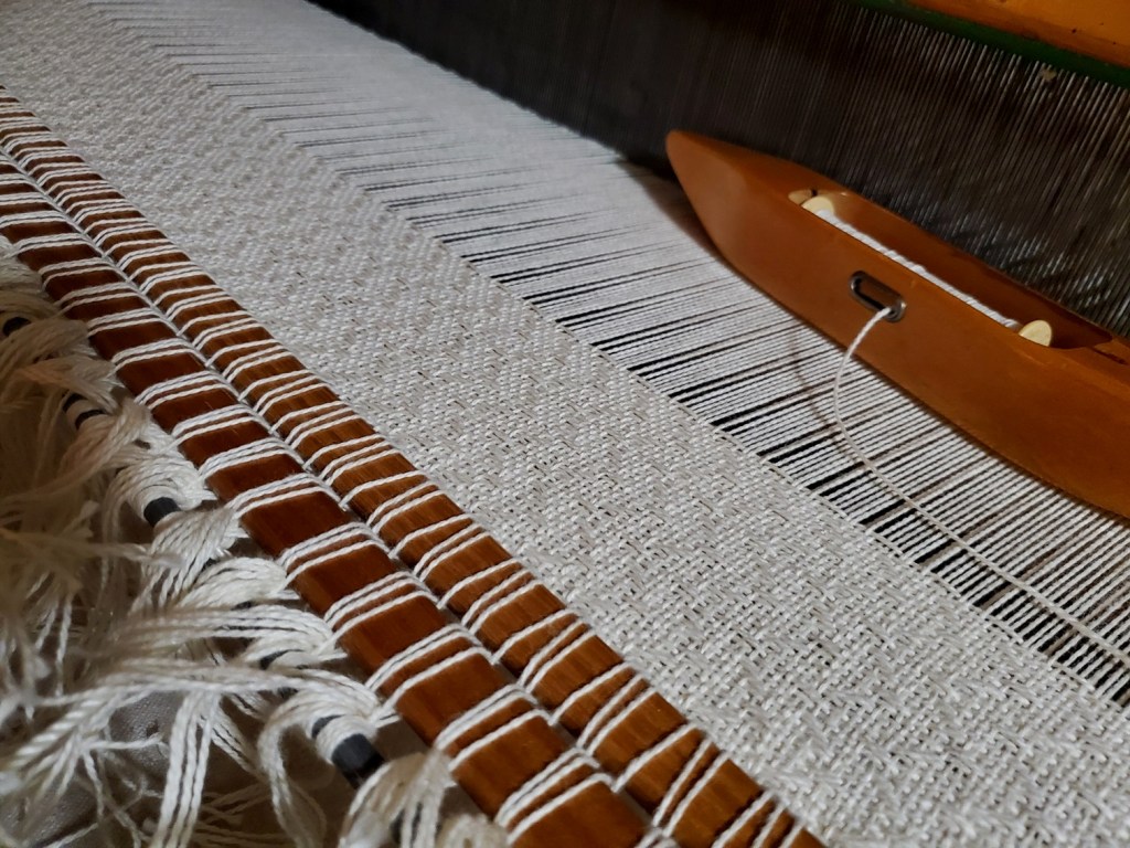 Weaving width 45″, 8 shaft floor loom, 12 epi, 5/2 & 3/2 cotton from the USA