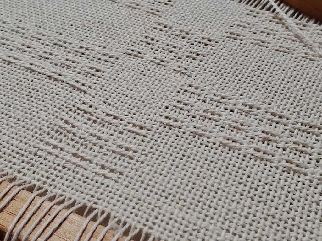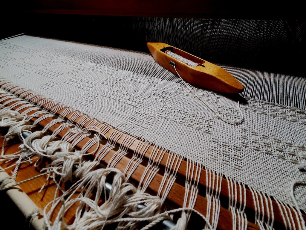 Weaving width 43″, 4 shaft floor loom, 12 epi, 5/2 & 3/2 cotton from the USA