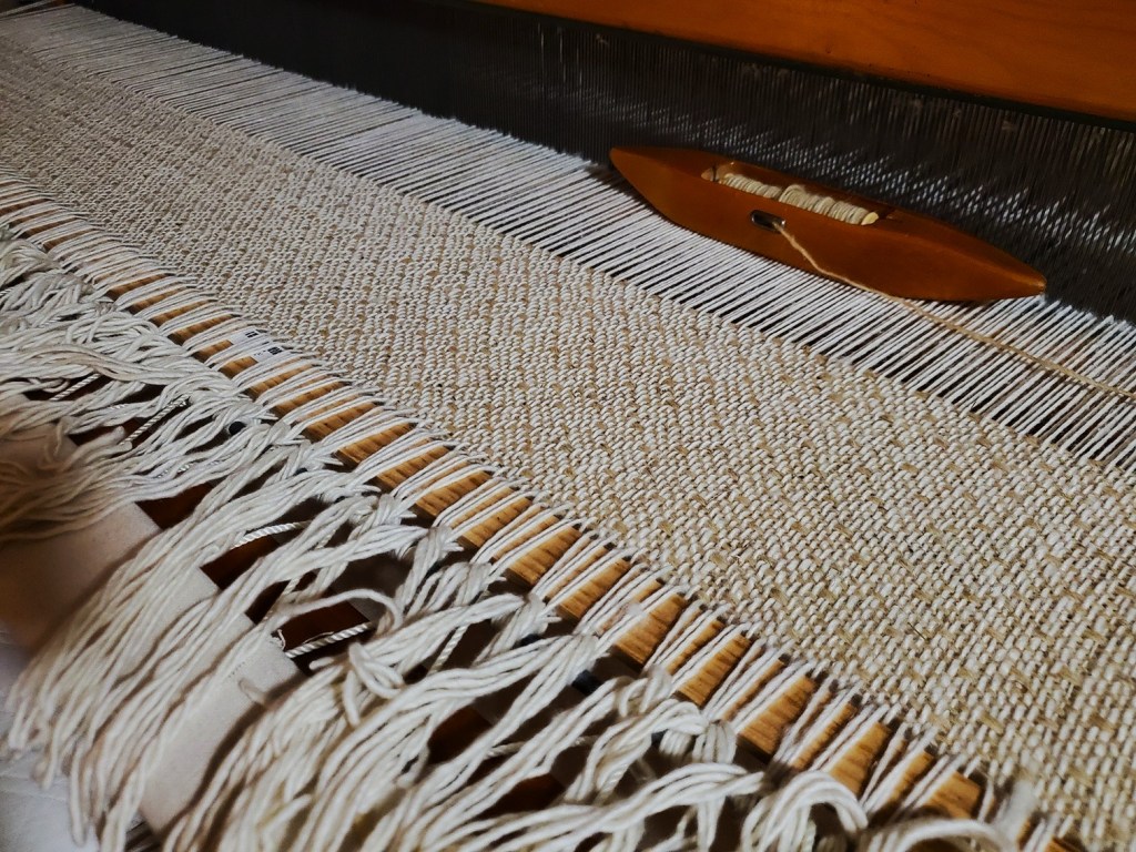 Weaving width 60″, 8 shaft floor loom, 8 epi